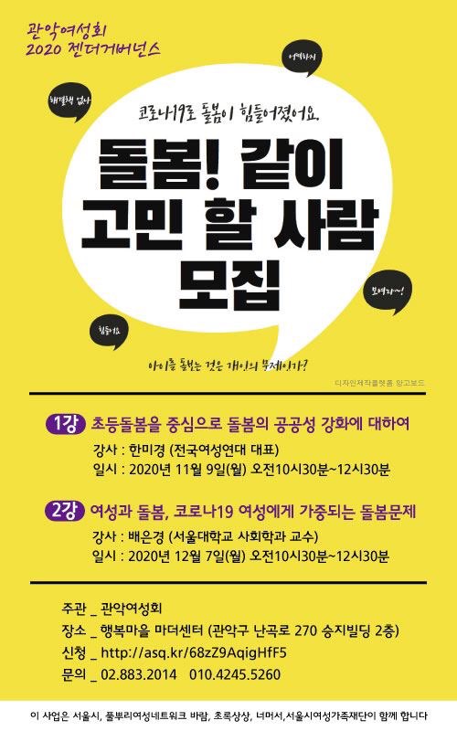 오늘(11월 9일) 오전 10시 30분, 관악여성회 2020젠더거버넌스, '돌봄! 같이 고민 할 사람' 강연에서 전국여성연대 한미경 대표가 강연을 진행했습니다.