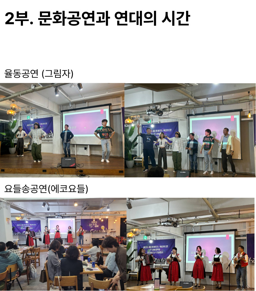 비상행동 자원봉사단 출신으로 결성된 그림자팀의 율동공연과 분당지역에서 활동하는 요들공연팀 에코요들의 신나는 공연과 참가자 인사 그리고,전국여성연대 활동영상과 내년 지방선거 출마를 준비하고 있는 회원들의 인사영상을 함께 보았습니다.