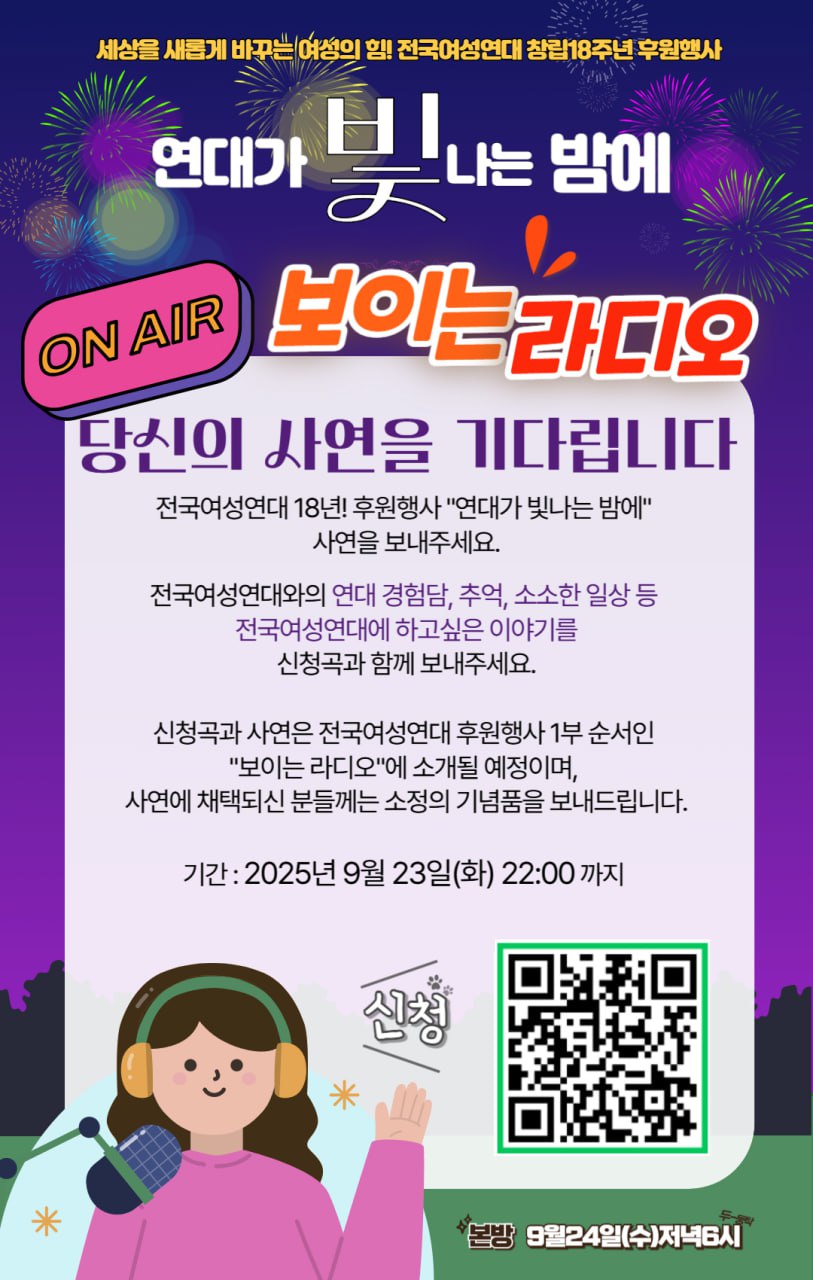 ● 신청곡과 사연은 전국여성연대 후원행사 1부 순서인 "보이는 라디오"에 소개될 예정이며,