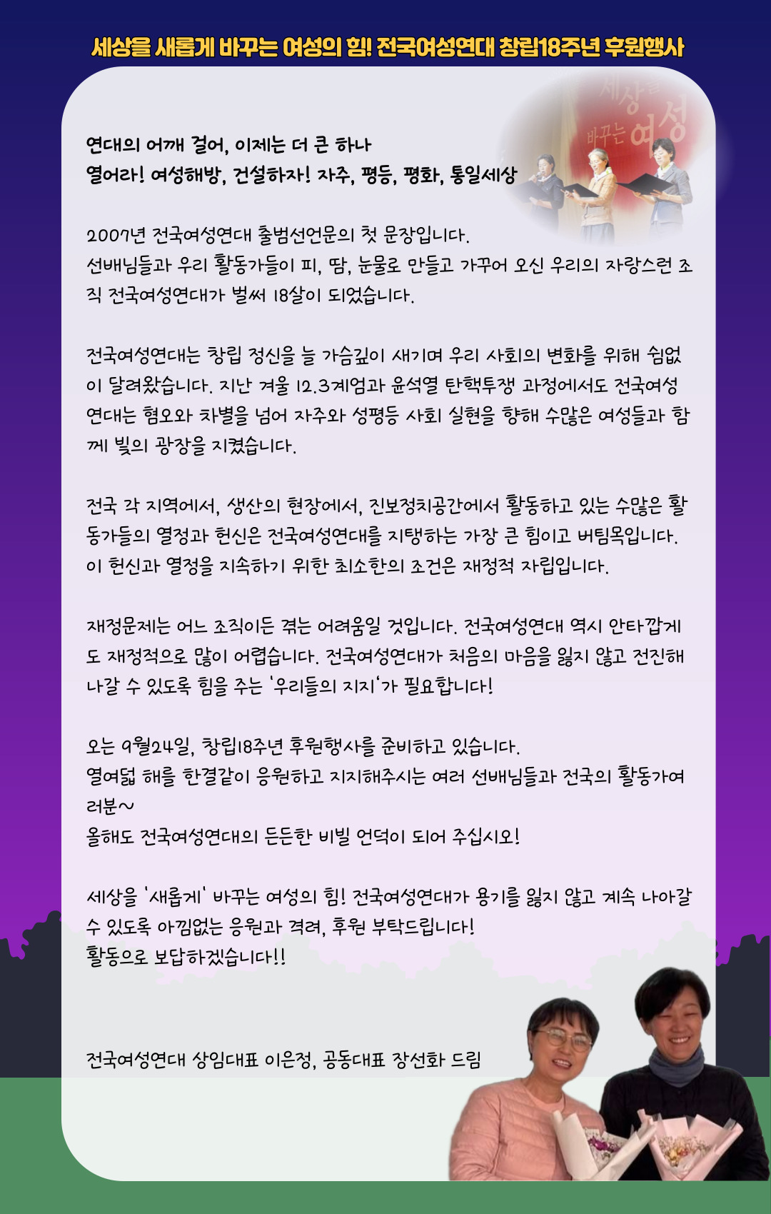 세상을 '새롭게' 바꾸는 여성의 힘! 전국여성연대가 용기를 잃지 않고 계속 나아갈 수 있도록 아낌없는 응원과 격려, 후원 부탁드립니다!