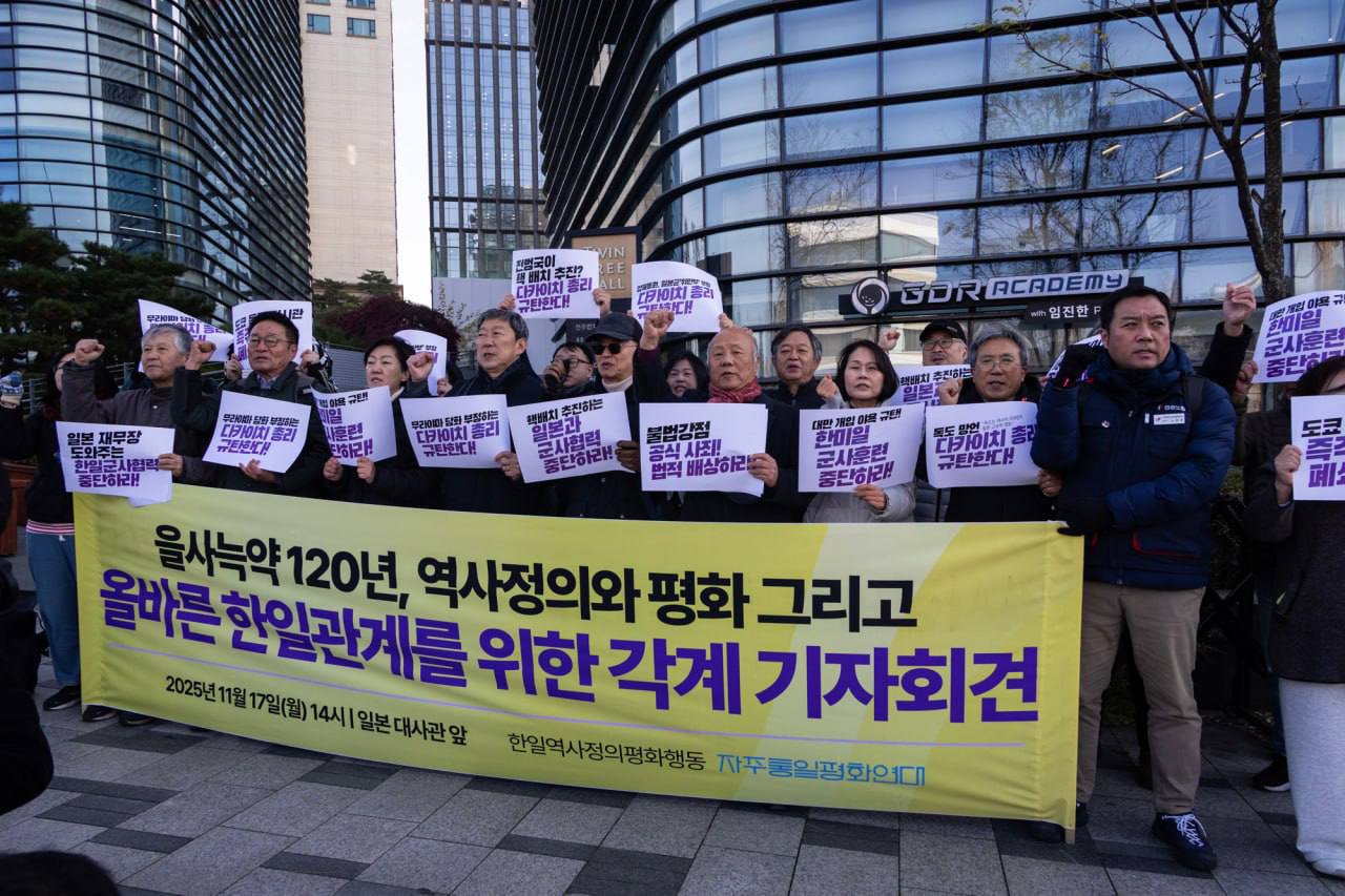 자주통일평화연대, 한일역사정의평화행동은 11월 17일 일본대사관 앞에서 을사늑약 120년을 맞아 역사정의와 평화를 촉구하는 기자회견을 진행하였습니다. 각계 발언자들은 일본 정부의 식민지배 부정, 위안부·강제동원 책임 회피, 독도 왜곡, 군사대국화 추진 등 극우·군국주의 노선을 강력히 규탄하였습니다.