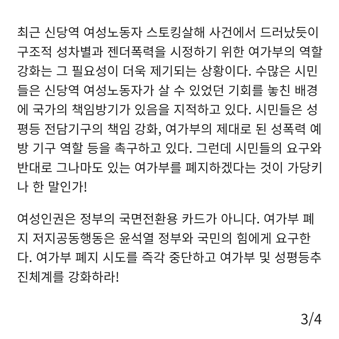 최근 신당역 여성노동자 스토킹살해 사건에서 드러났듯이 구조적 성차별과 젠더폭력을 시정하기 위한 여가부의 역할 강화는 그 필요성이 더욱 제기되는 상황이다. 수많은 시민들은 신당역 여성노동자가 살 수 있었던 기회를 놓친 배경에 국가의 책임방기가 있음을 지적하고 있다. 시민들은 성평등 전담기구의 책임 강화, 여가부의 제대로 된 성폭력 예방 기구 역할 등을 촉구하고 있다. 그런데 시민들의 요구와 반대로 그나마도 있는 여가부를 폐지하겠다는 것이 가당키나 한 말인가!