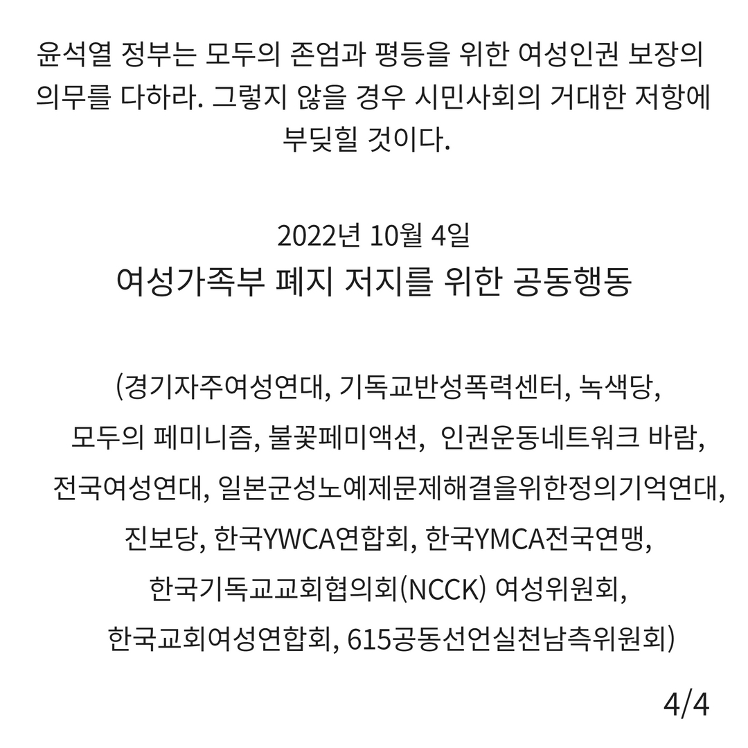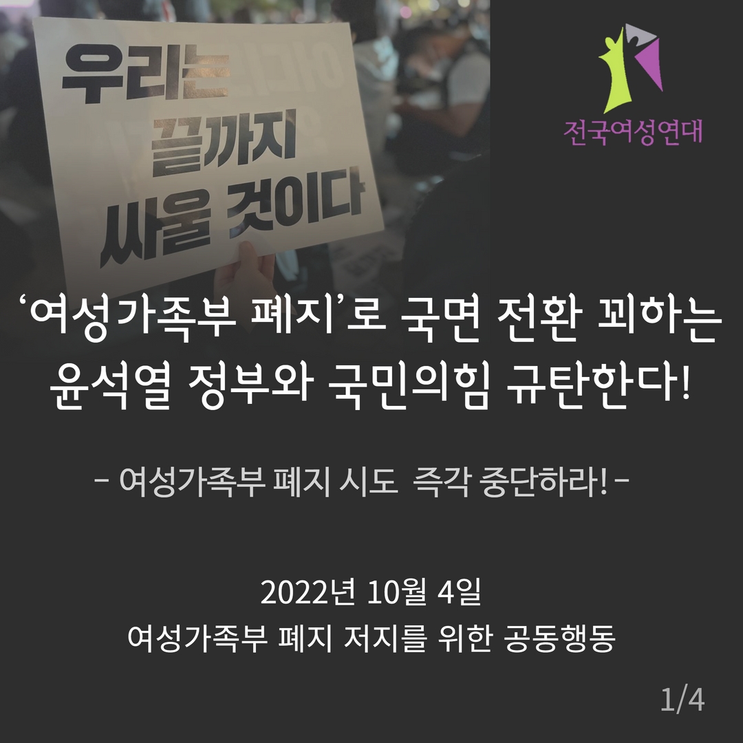 여성인권은 정부의 국면전환용 카드가 아니다. 여가부 폐지 저지공동행동은 윤석열 정부와 국민의 힘에게 요구한다. 여가부 폐지 시도를 즉각 중단하고 여가부 및 성평등추진체계를 강화하라!