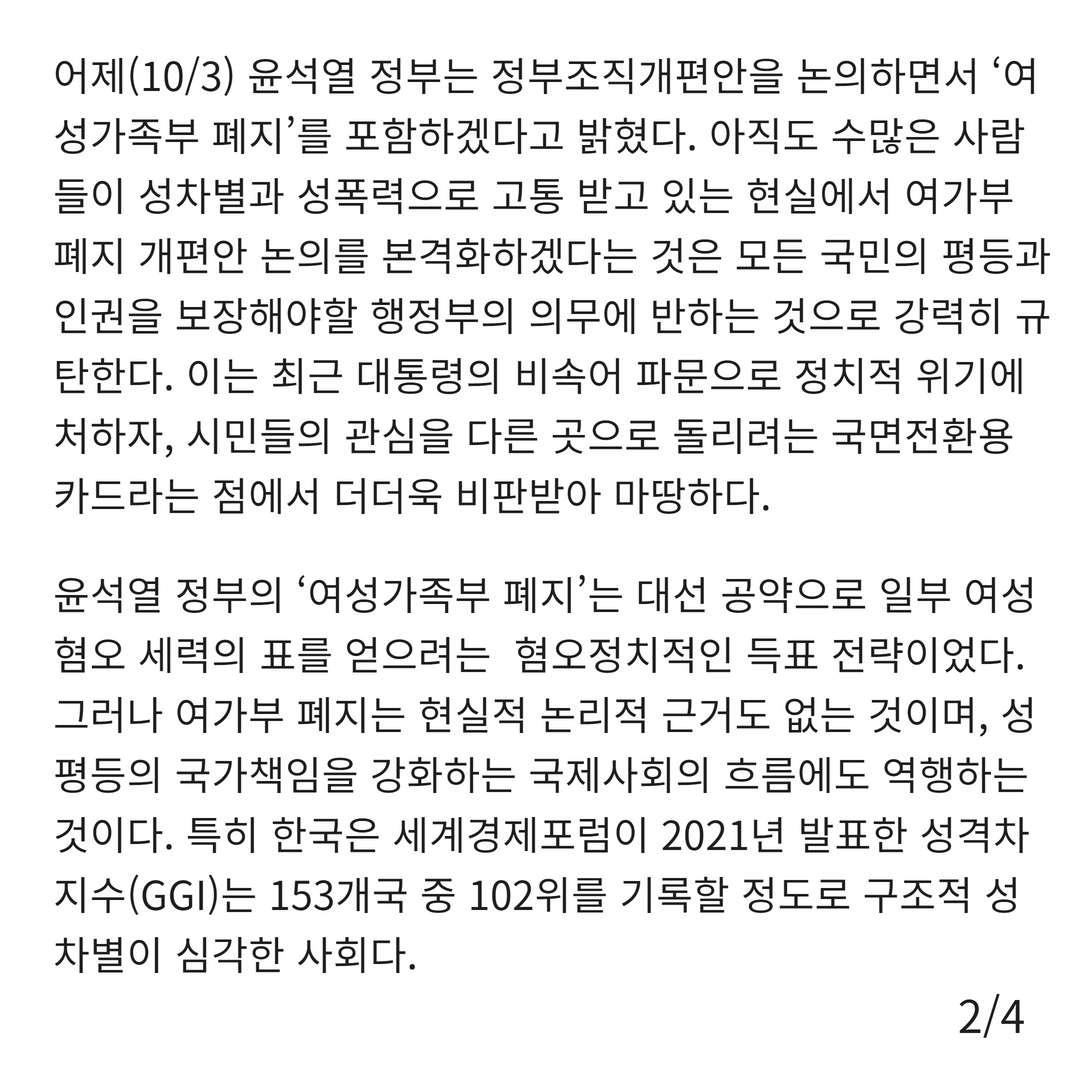 윤석열 정부의 ‘여성가족부 폐지’는 대선 공약으로 일부 여성혐오 세력의 표를 얻으려는 혐오정치적인 득표 전략이었다. 그러나 여가부 폐지는 현실적 논리적 근거도 없는 것이며, 성평등의 국가책임을 강화하는 국제사회의 흐름에도 역행하는 것이다. 특히 한국은 세계경제포럼이 2021년 발표한 성격차지수(GGI)는 153개국 중 102위를 기록할 정도로 구조적 성차별이 심각한 사회다.