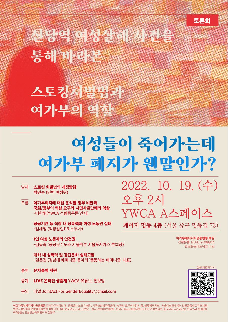 3. 이에 여성가족부 폐지 저지를 위한 공동행동(약칭, 여가부폐지 저지 공동행동)에서는 스토킹 처벌법의 개정방향과 여성노동자와 여성청년이 겪는 현실을 말하고, 여가부 폐지 시도의 문제점과 정부의 역할에 대해서 논의하는 토론회를 10월 19일 2시에 개최합니다.